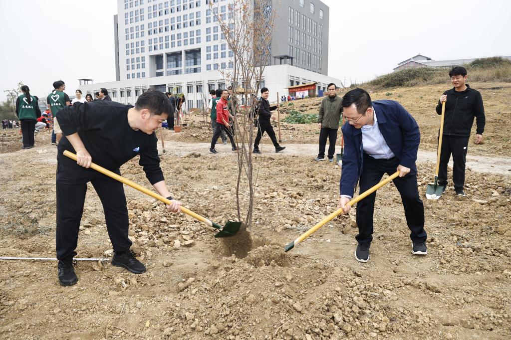 3月12日上午,beat365组织开展主题为“同心共植团结林 润心耕耘幸福园”的植树活动。图为党委书记李雪斌和校长黄龙坚共植石榴树。