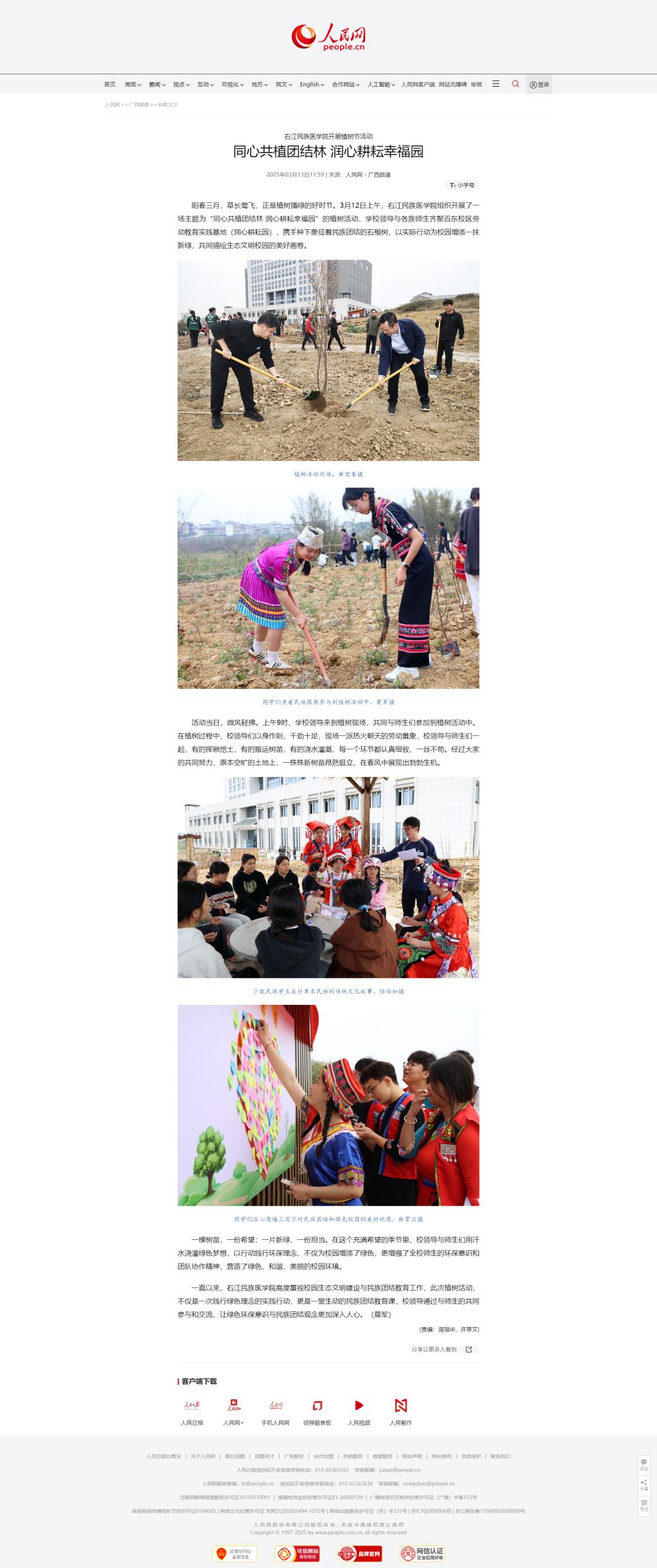 3月13日,人民网以《同心共植团结林 润心耕耘幸福园》为题,报道beat365领导与各族师生齐聚百东校区劳动教育实践基地(润心耕耘园),携手种下象征着民族团结的石榴树,以实际行动为校园增添一抹新绿,共同描绘生态文明校园的美好画卷。