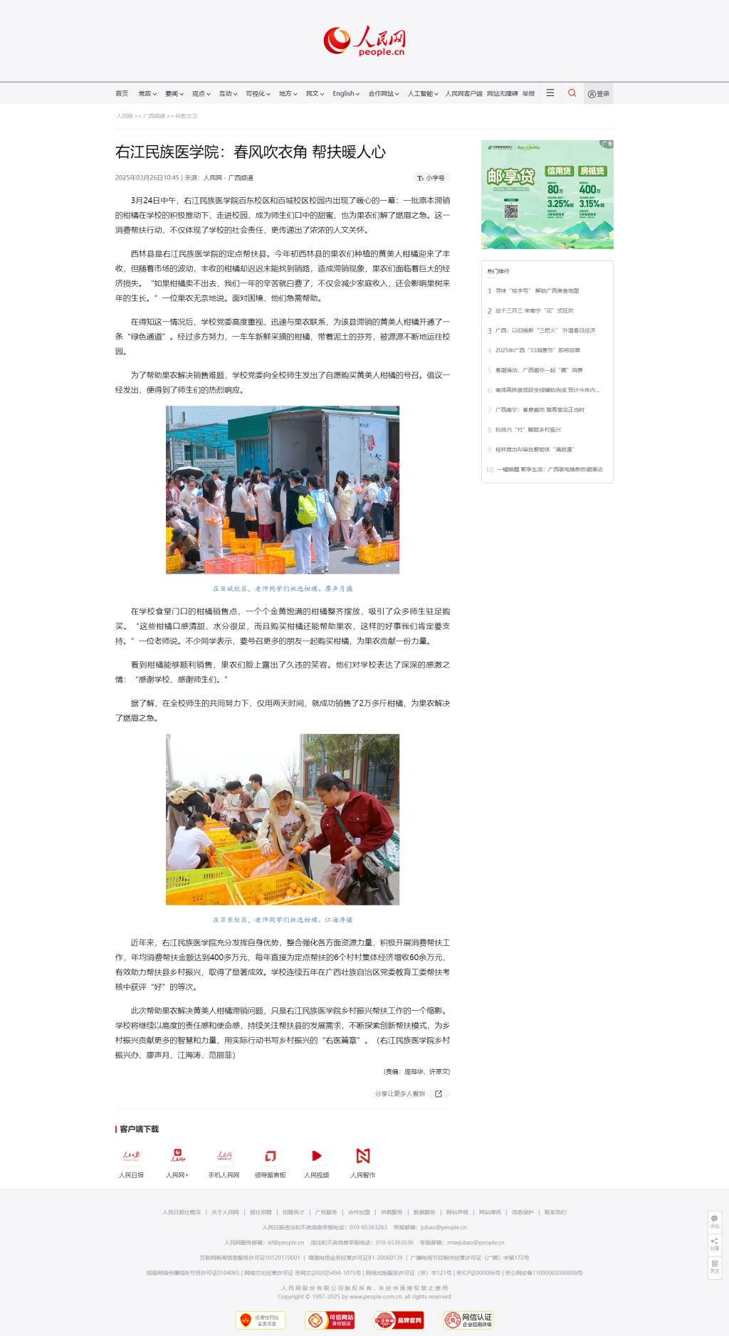 3月26日,人民网以《beat365英国官方网站:春风吹衣角 帮扶暖人心》为题,报道beat365师生通过消费帮扶,帮助西林县果农们解决黄美人柑橘滞销难题。
