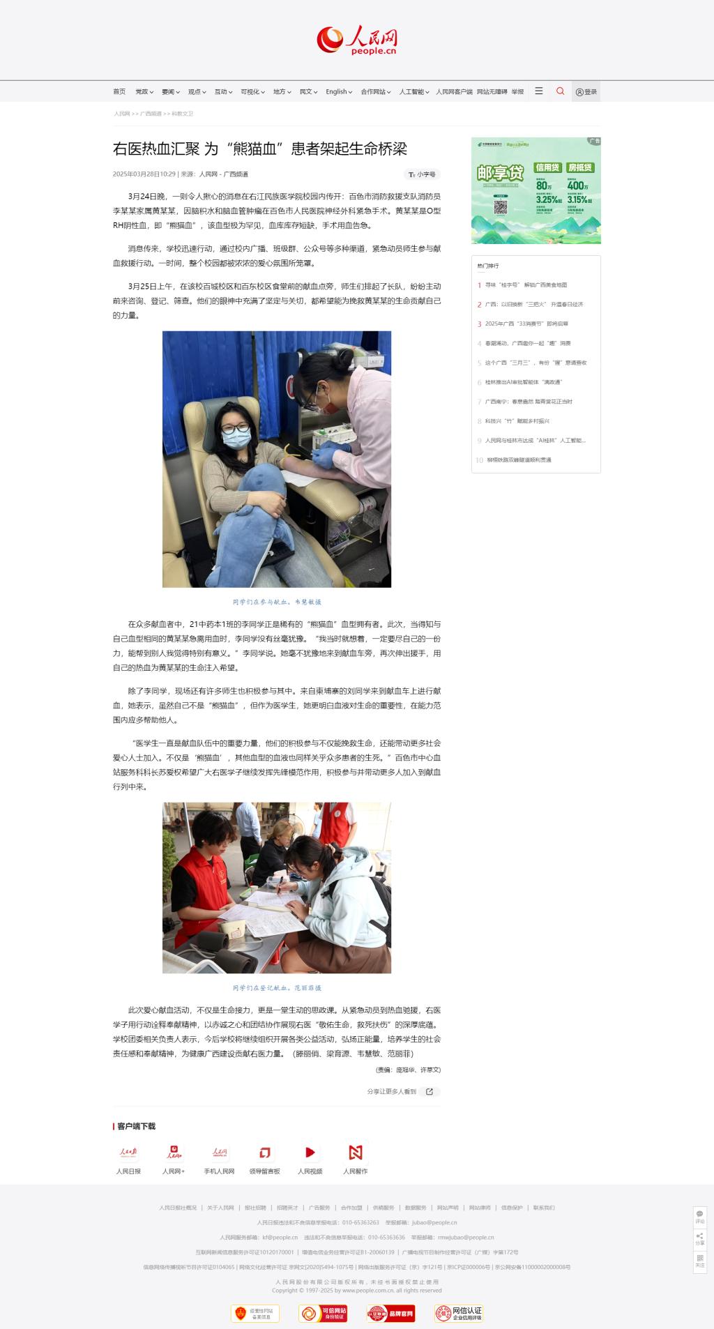 3月28日,人民网以《右医热血汇聚 为“熊猫血”患者架起生命桥梁》为题,报道beat365beat365师生积极为为“熊猫血”患者献血,用爱心架起生命桥梁。