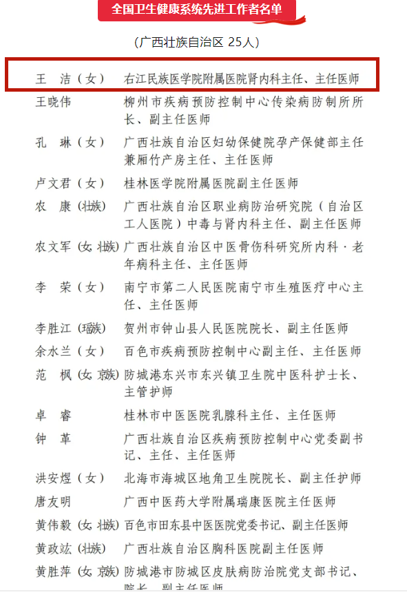 右医附院肾内科主任王洁教授获评“全国卫生健康系统先进工作者”殊荣。