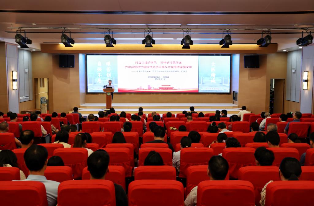 李雪斌以《持之以恒抓作风 警钟长鸣筑防线 为建设新时代区域性高水平医科大学提供坚强保障》为题,系统阐述了中央八项规定及其实施细则精神的核心要义和深入贯彻中央八项规定精神学习教育的实践要求,运用多个案例,深刻剖析了违反中央八项规定精神的突出问题,为学校党员干部学深悟透习近平总书记关于加强党的作风建设的重要论述提供了生动教材和鲜活案例。