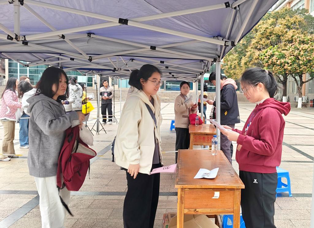 考务人员严格遵照培训要求,耐心为每位考生进行身份核验、安全检查等工作;考场外贴心设置了醒目的引导标识,安排考务人员细心引导,并设立物品寄存处,方便考生快速入场;试卷领取、分发、回收等关键环节全程开启视频监控,以细致周全的举措维护考试公平,筑牢保密防线。
