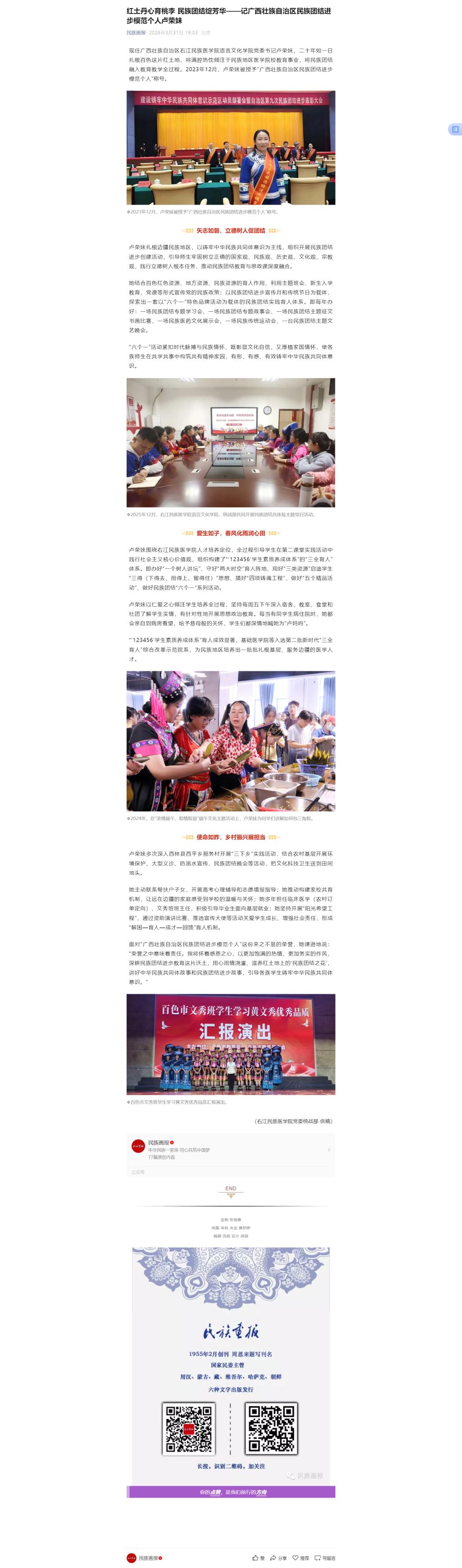 3月31日,民族画报以《红土丹心育桃李 民族团结绽芳华——记广西壮族自治区民族团结进步模范个人卢荣妹》为题,报道beat365语言文化学院党委书记卢荣妹,二十年如一日扎根百色这片红土地,将满腔热忱倾注于民族地区医学院校教育事业,将民族团结融入教育教学全过程的典型事迹。