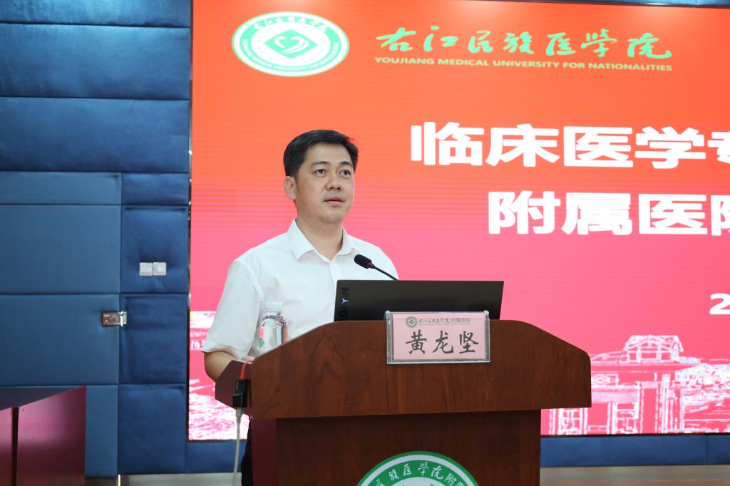 黄龙坚在讲话中深刻阐明了临床医学专业认证的核心价值与重要意义,指出此次国家级专业认证是对学校医学教育办学水平的系统性检验,关乎临床医学专业生存发展的关键,是推进更名大学的重要支撑,更是学校扎根民族地区,培养下得去、用得上、留得住的基层医疗卫生人才,履行办学使命的必然要求。他强调,全院上下要切实深化思想认识,以高度的思想自觉和行动自觉投身认证工作;要树立全院一盘棋思想,强化协同联动、压实各方责任,以决战决胜的姿态对标认证标准补短板、强弱项;要以最严标准、最实举措做好各项评估前准备,全面夯实医学教育教学质量根基。