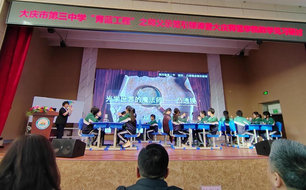 启动会后,王玉玲副院长带领22级物理学专业指导教师及22级物理学专业全体同学赴大庆市第三中学进行教育见习。本次活动大庆市第三中学高度重视、将教育见习与大庆市第三中学“青蓝工程”之师父引领示范课堂活动相结合、大庆市让胡路区教育局副局长钟海涛、让胡路区进修校校长崔海彬、副校长潘明浩、大庆市第三中学学校长高峰、副校长刘鋆星出席此次活动。精彩的公开课《光学世界的魔法师--凸透镜》在轻松愉悦的氛围中进行,物理学专业师范生收获颇丰,会后物理学专业全体师范生也对本课例的亮点进行交流研讨并形成教学设计方案以提升教学技能做到学以致用。