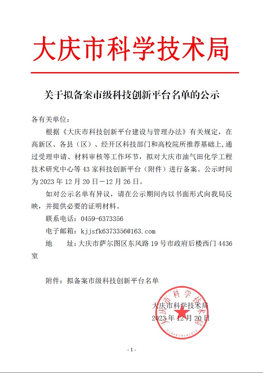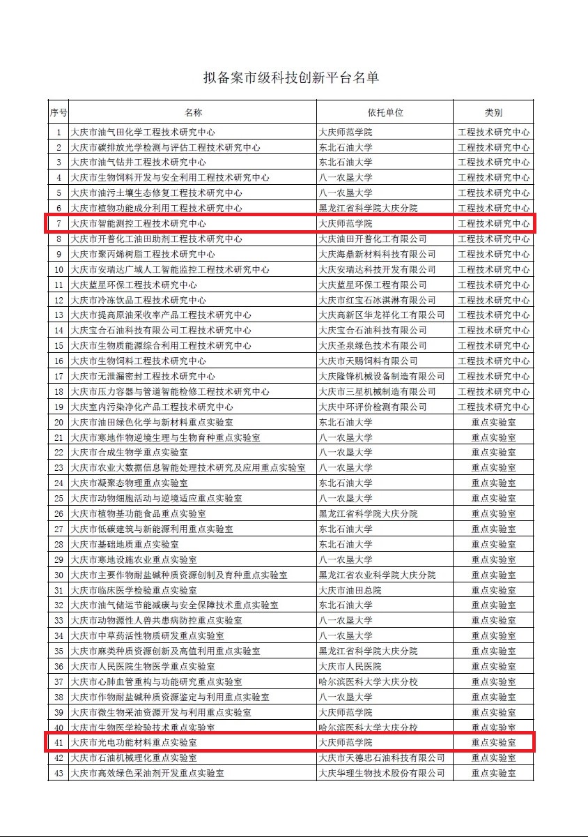 近日,大庆市科学技术局公布了市级科技创新平台名单,全市合计43家科技创新平台入选。开云申报的“大庆市智能测控工程技术研究中心”、“大庆市光电功能材料重点实验室”成功获批备案。