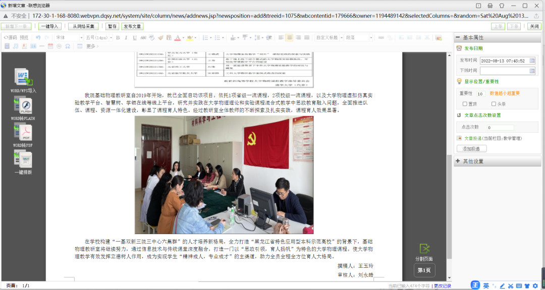 在学校构建“一基双新三院三中心六集群”的人才培养新格局,全力打造“黑龙江省特色应用型本科示范高校”的背景下,基础物理教研室将继续努力,通过信息技术与传统课堂深度融合,打造一门以“思政引领,育人扬帆”为特色的大学物理课程。使大学物理教学有效发挥立德树人作用,成为实现学生“精神成人,专业成才”的主渠道,助力全员全程全方位育人大格局。