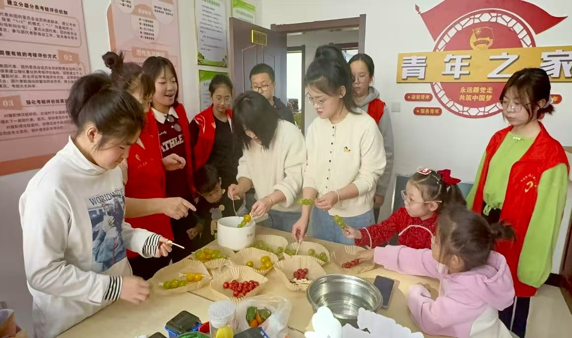 在“青年之家”,青年志愿者们与孩子们欢聚一堂,共同开展了一场别开生面的制作活动。大家围坐在桌旁,手中拿着竹签,串起五彩斑斓的水果,现场气氛热烈而温馨,欢声笑语不断。这次实践活动不仅为孩子们带来了无尽的欢乐,让他们在动手制作中感受到了创造的乐趣,也让志愿者们收获了满满的幸福与满足。在互动中传递温暖,展现了青年服务社会、关爱儿童的担当,为社区增添一抹温馨色彩。