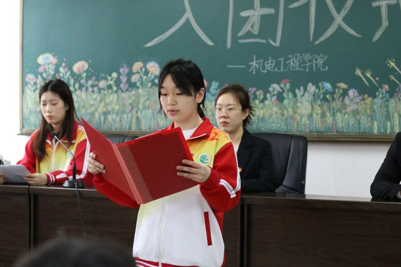 新团员代表孙雪同学在发言中表示,加入共青团是人生道路上的一个新起点,今后将以团员的标准严格要求自己,努力学习,积极进取,用实际行动践行入团誓言。
