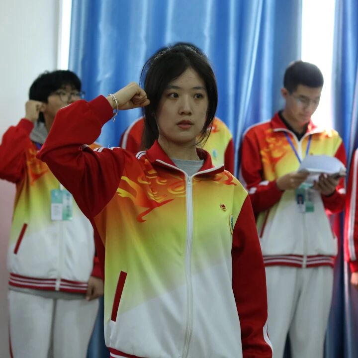 随后,在领誓人陈衫同学的带领下,新团员面向鲜艳的团旗,高举右拳,庄严宣誓:“我志愿加入中国共产主义青年团……”铮铮誓言,铿锵有力,表达新团员们对共青团组织的无限向往和为团组织增光添彩的坚定决心。